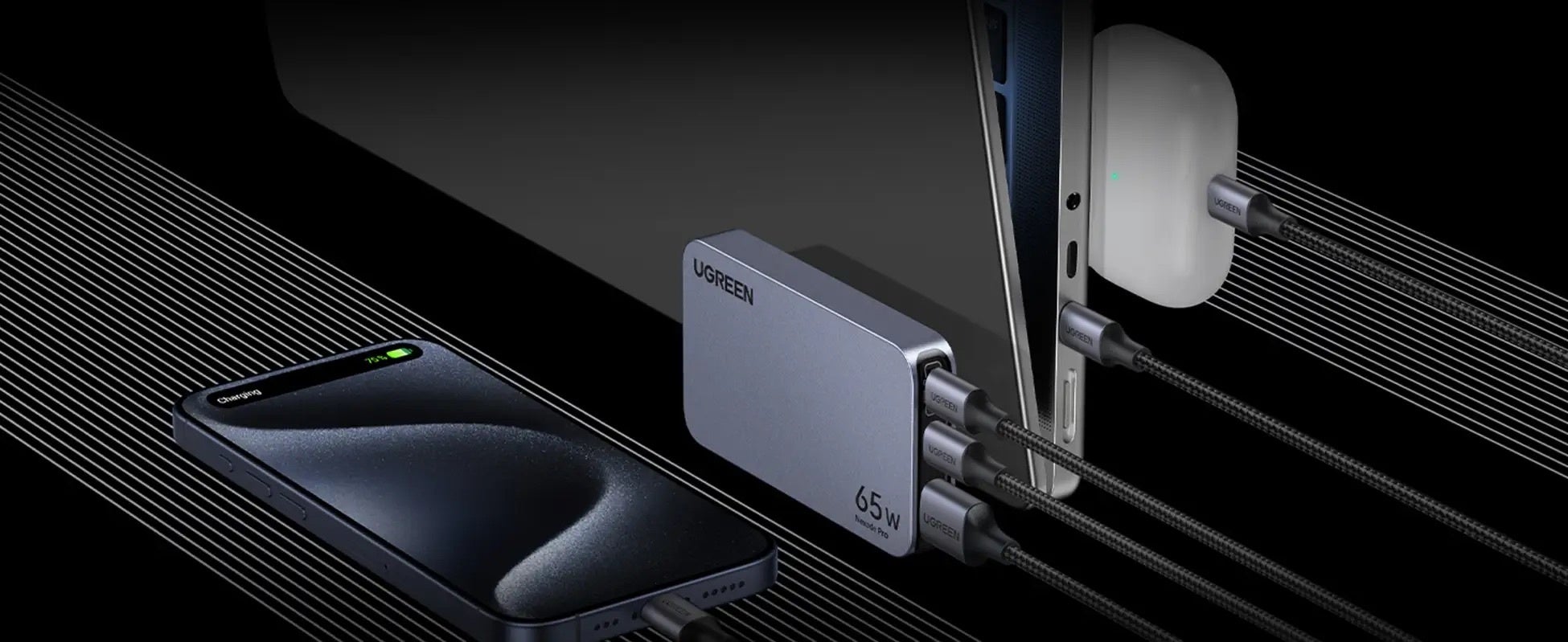 UGREEN Nexode Pro 65W GaN 薄型急速充電器は、これまでのUGREENの充電器のなかでも、最もスリムな設計となった急速充電器です。薄型でありながら、高出力が特徴であり、30分でMacBook Air 13インチを0%から50%以上まで充電できます。