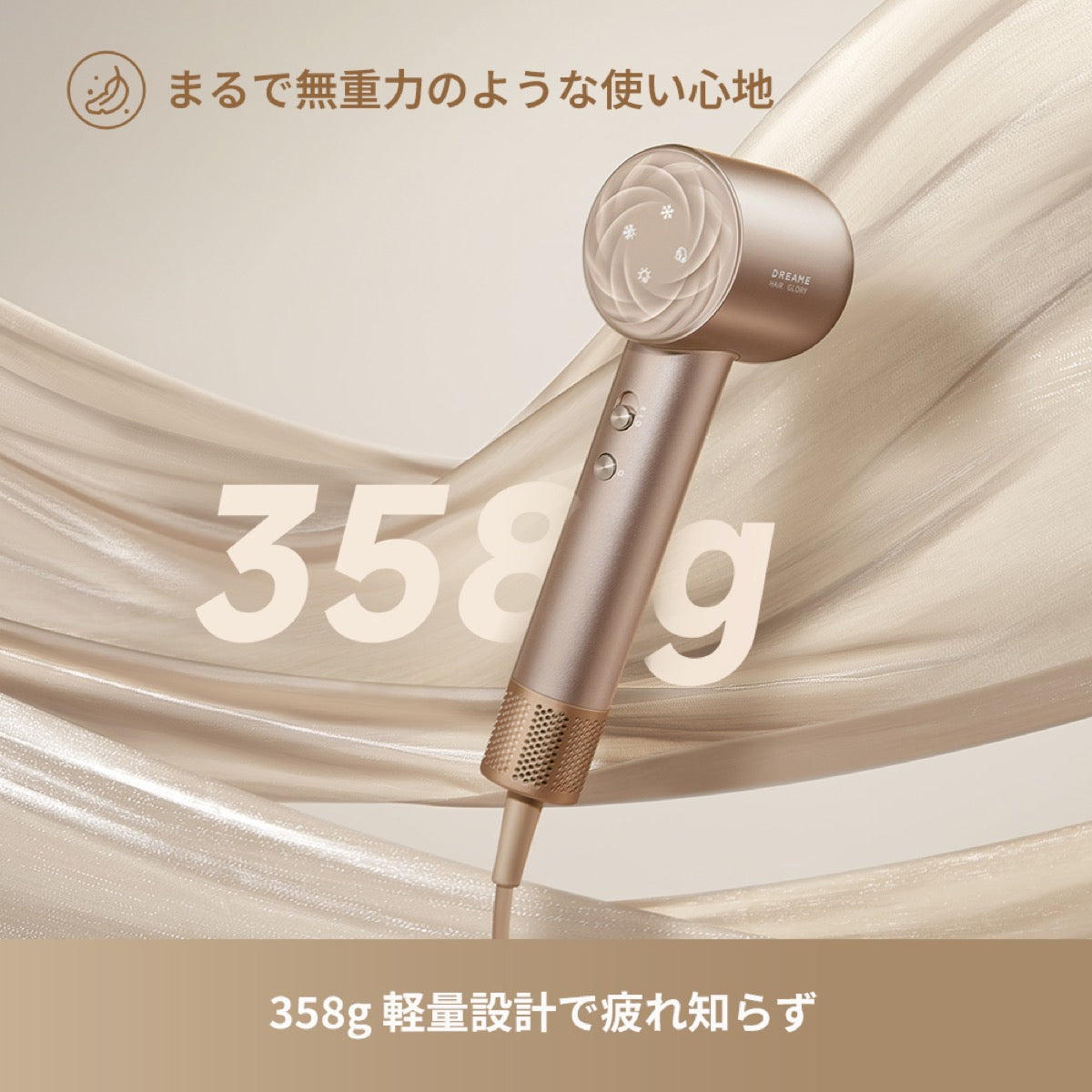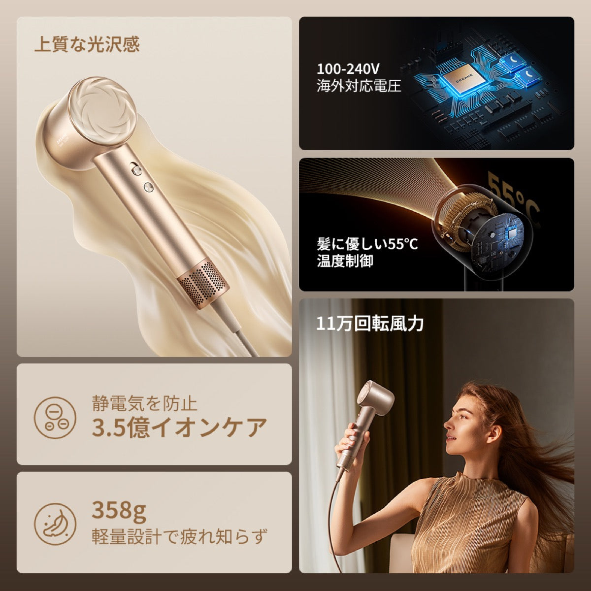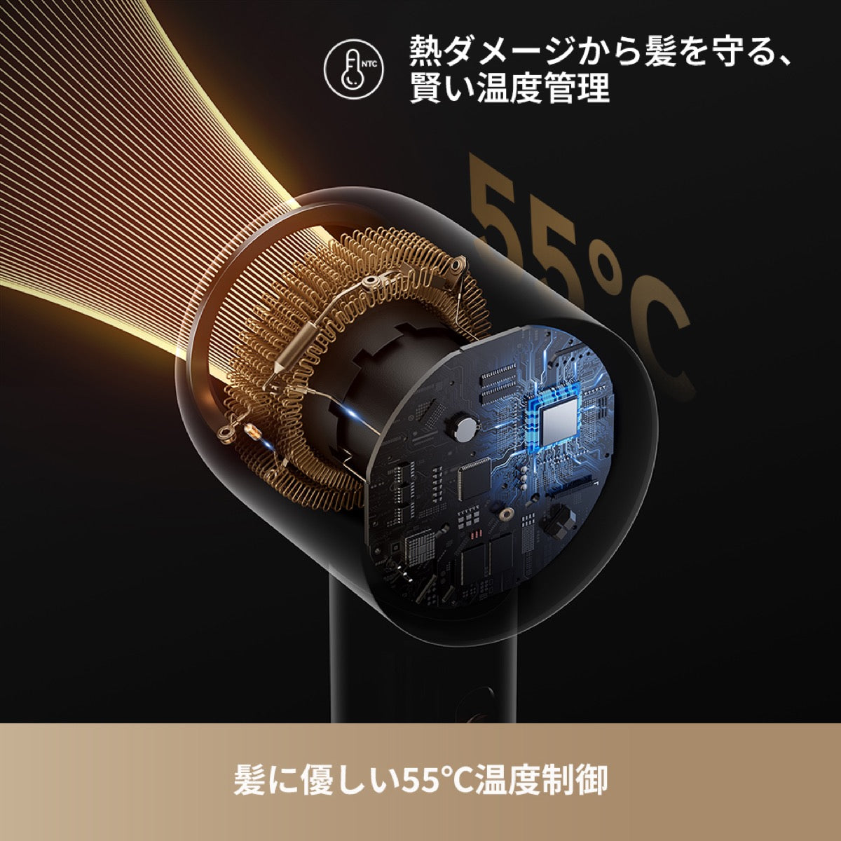 最適化された垂直構造を備えた強力プラシレスモーターは、ノイズを58dB未満に抑えながらも大風量を実現。音楽やスマートフォンでの通話を楽しみながらでも髪を乾かすことができ、リラックスタイムを邪魔しません。