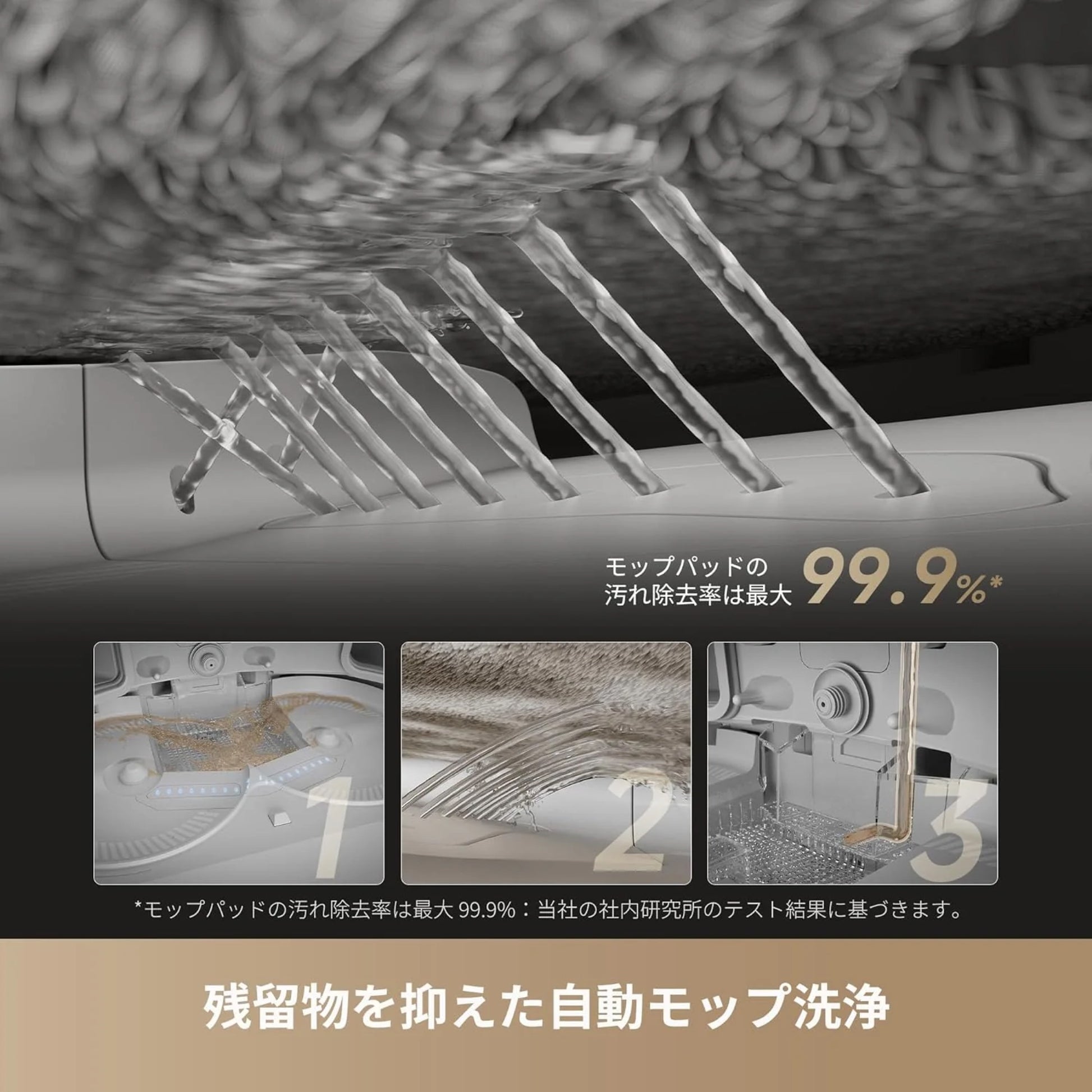 水拭きでは、TripleUpテクノロジーが両側のサイドブラシとメインブラシをそれぞれ最大10mm* および5mm* 持ち上げることでモップを下げて、 醤油やコーヒーなどの頑固なシミをきれいにします。ブラシを濡らさないため、ダストビンに不快な臭いが残りません。掃除機のパワーを落とすことなく、きれいで清潔な状態を保ちながら掃除します。