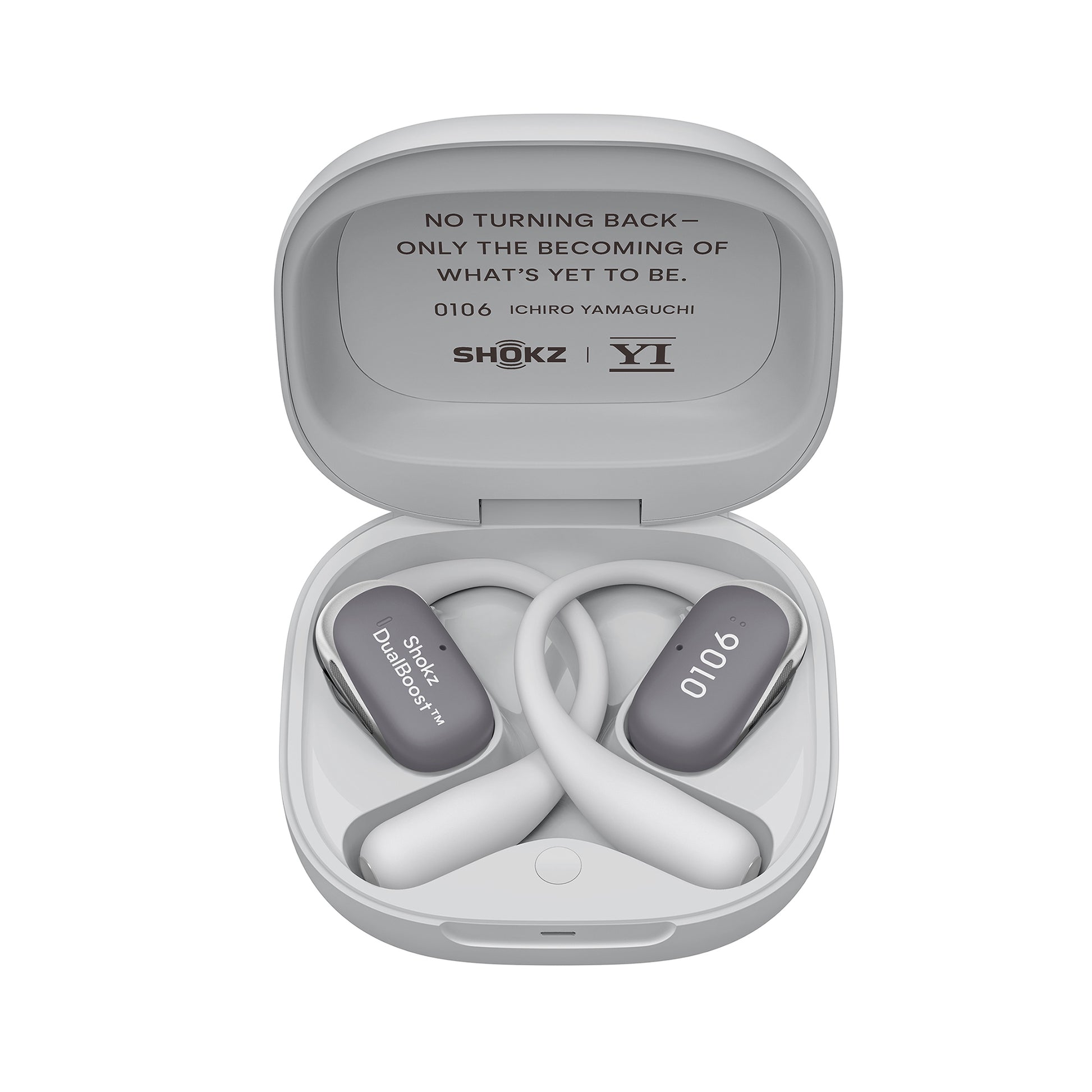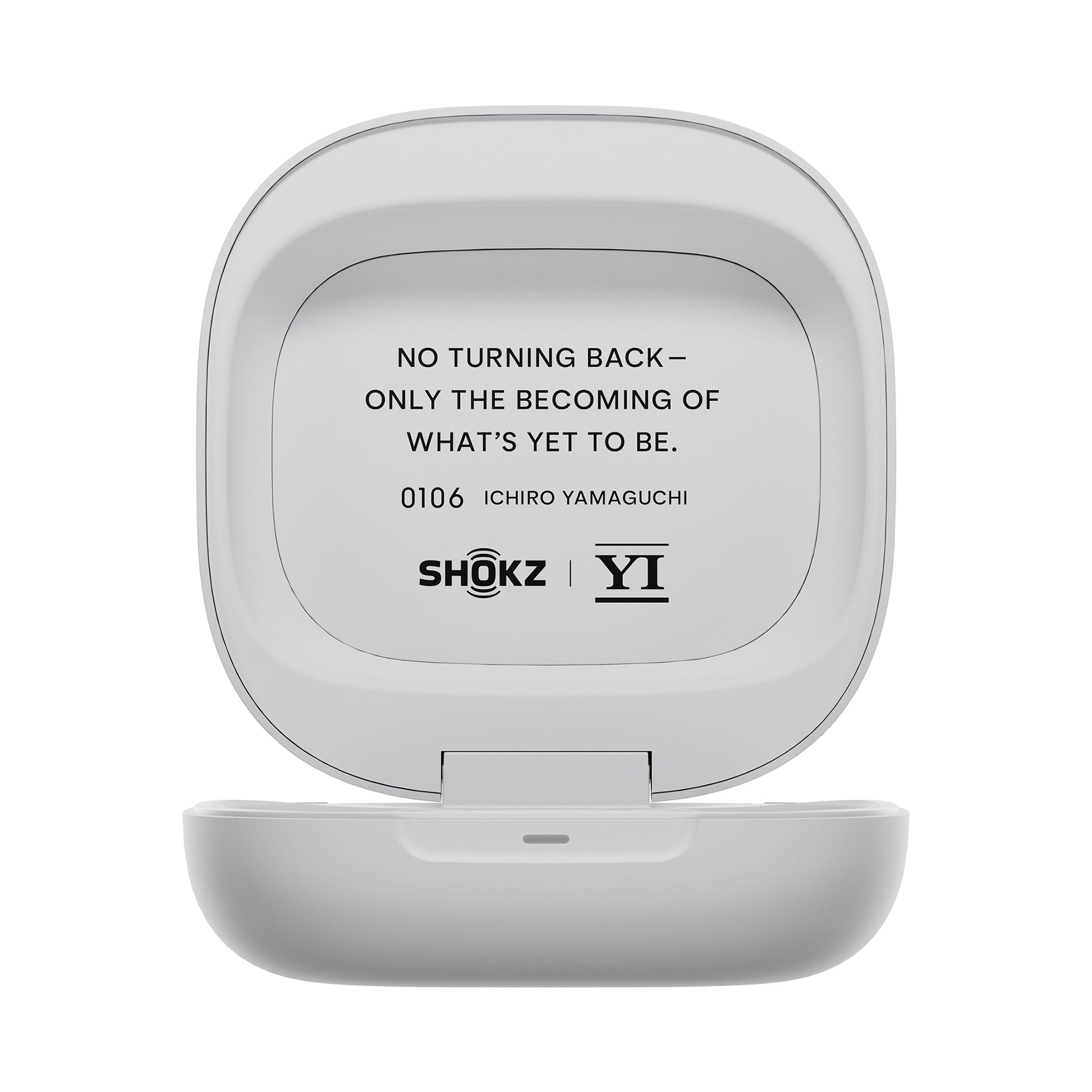 充電ケースの内側には、山口一郎の座右の銘とも言える言葉を刻印。(No turning back-only the becoming of what's yet to be.)(元に戻るのではなく、新しくなる)これは、過去に固執せず、新しい「聴き方」へと踏み出す勇気の言葉です。