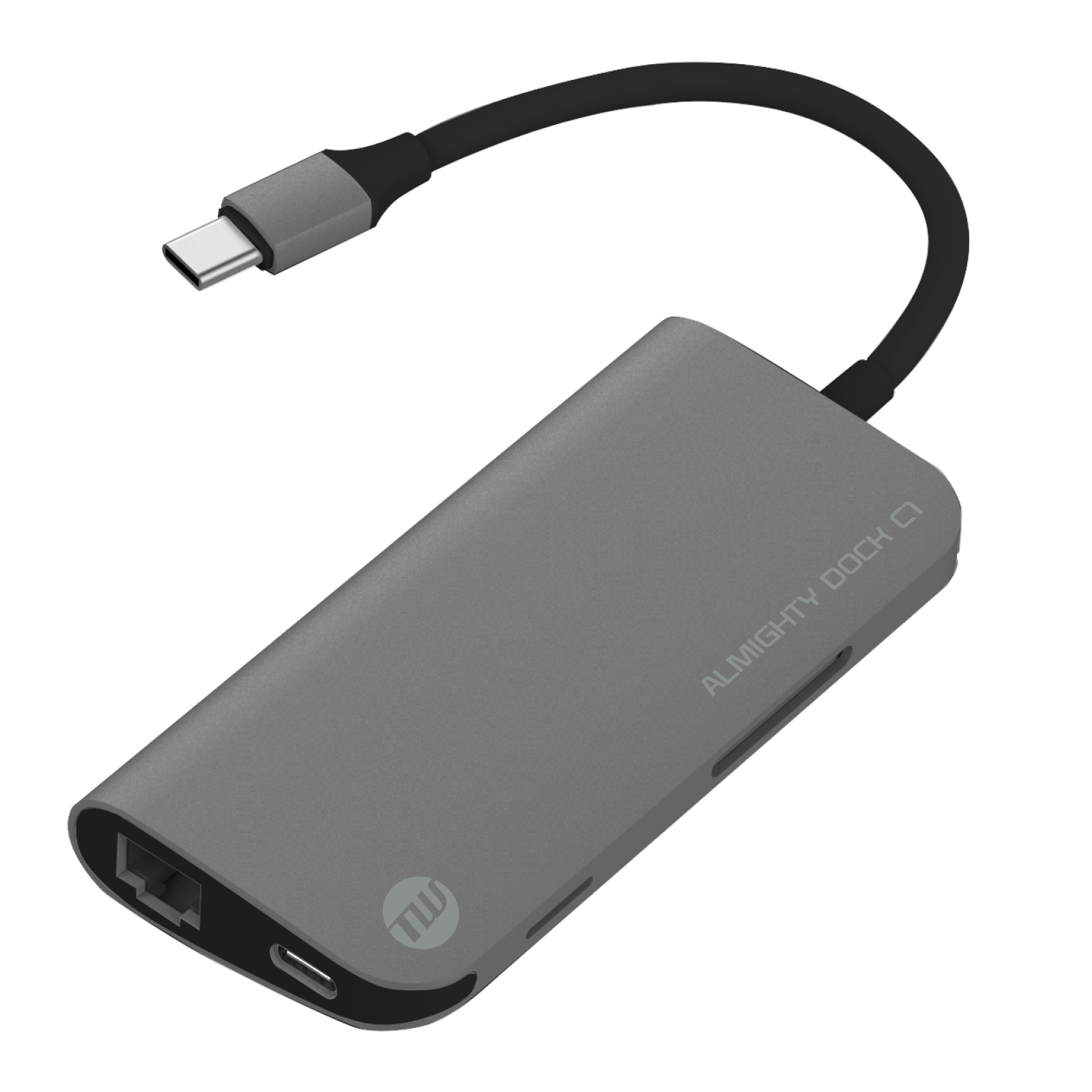 TUNEWEAR ALMIGHTY DOCK C1(チューンウェアオールマイティドックシーワン)は、最新のMacBookなど多くのパソコンで採用されているUSB type-Cコネクタを7種類のインターフェイスに変換することができる変換アダプタです。一般的なUSB-A、SDカード/microSDカードスロットに加え、画面出力インターフェースのHDMI、有線でのインターネット接続をするためのLAN(Ethernet)ポート、そして電源供給するためのUSB-Cポートを1つ搭載しています。